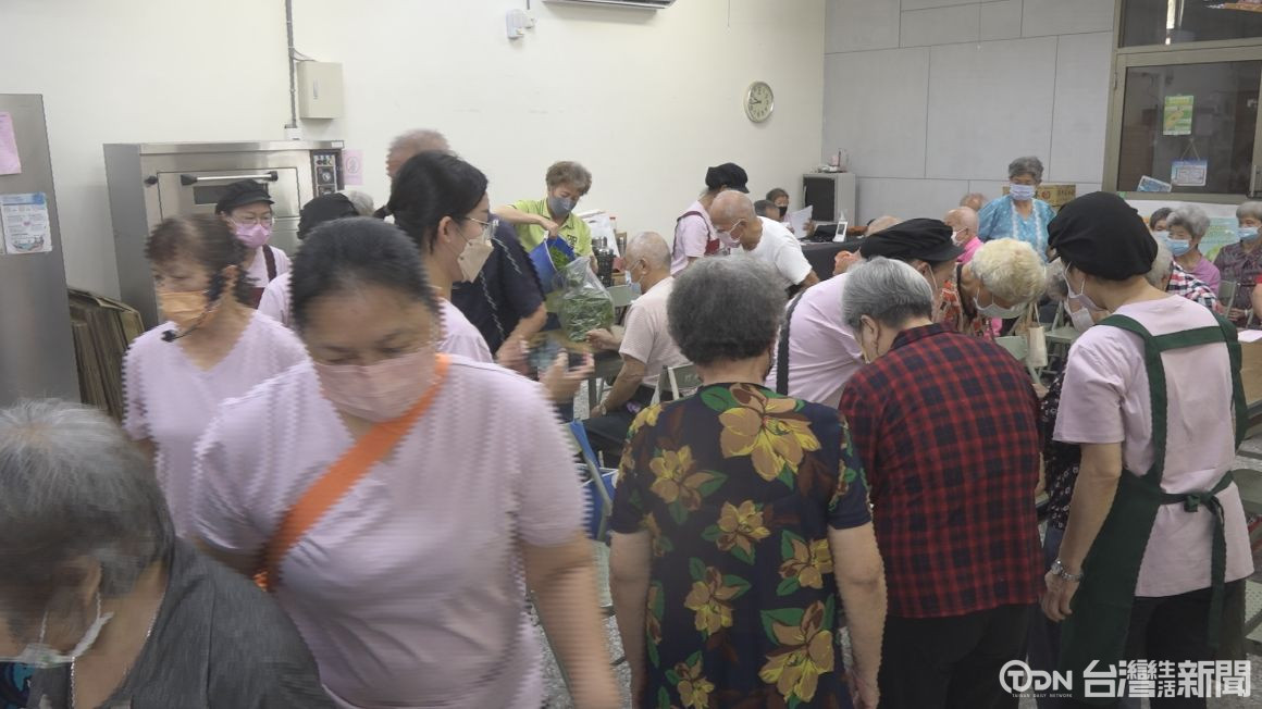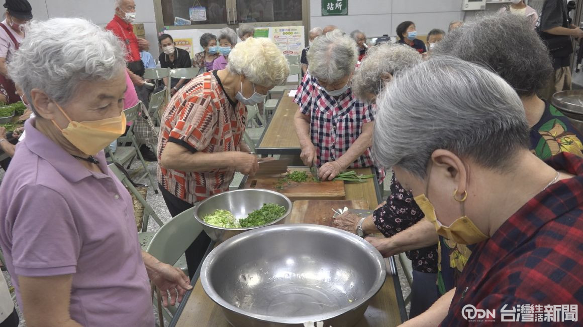 ▲社區長輩圍在桌子邊,大家分工合作,有的切菜,有的在剝蒜頭,現場氣氛相當熱鬧。/記者 周有勝 攝