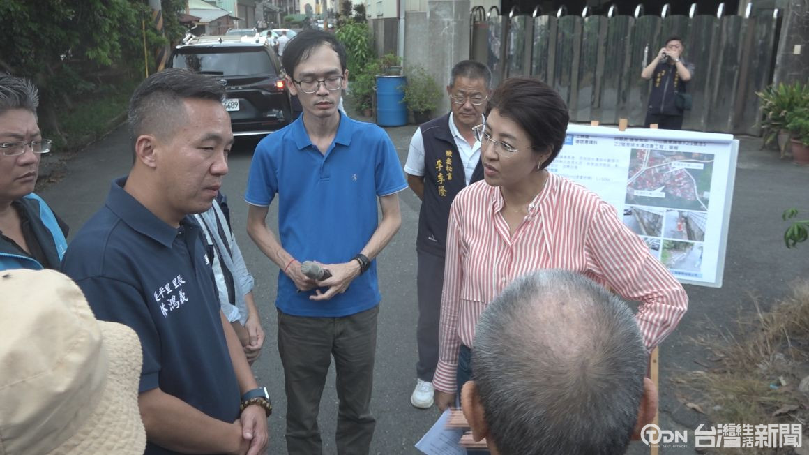 ▲延平里東興巷排水溝年久失修,每逢大雨就有淹水情形,為了解決這個問題,南投縣長許淑華到現場會勘。/記者 周有勝 攝