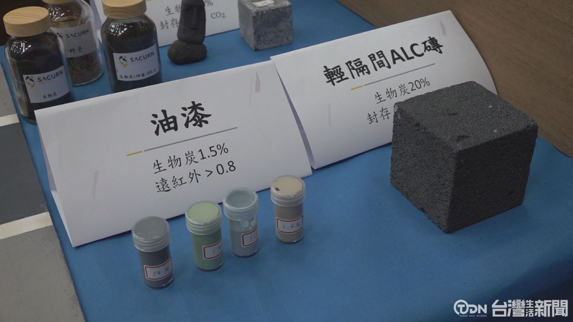 活動現場也展示建材與加工樣品,像是油漆、磚塊等,都是利用竹廢料經過破碎與再製,轉化為生物炭後開發出的新應用。