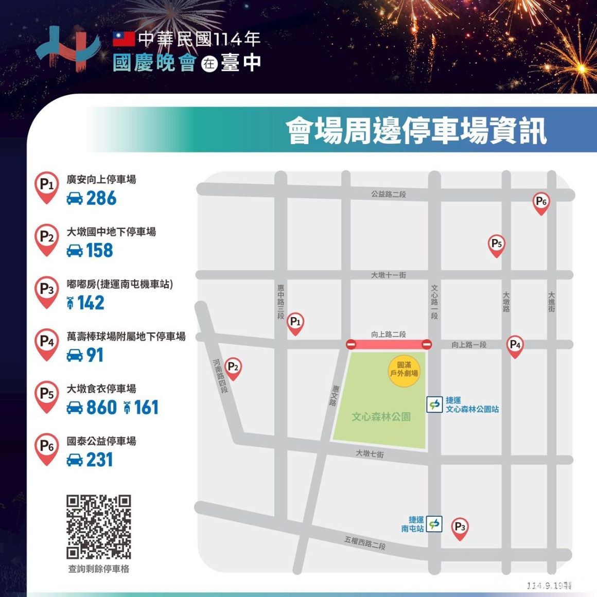 114年國慶晚會將於10月9日,在文心森林公園圓滿戶外劇場盛大登場,當天適逢國慶連續假期前夕,而且是下班交通尖峰時段,會場周邊道路交通流量大,為維護交通秩序,向上路下午2點將雙向封閉禁止車輛通行,文心森林公園周邊停車場也將清空暫停使用,市警局建議參加活動市民多利用大眾運輸。