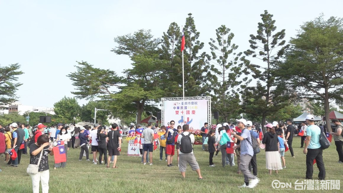 今年的升旗典禮現場來了上千位民眾參與,多人手拿著小國旗,聚集在西拉雅廣場一起向國旗致敬,祝福國家生日快樂。