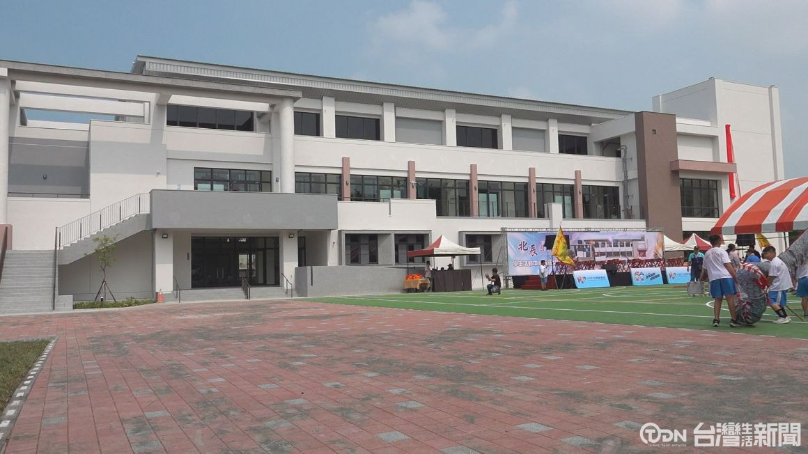▲北港鎮北辰國小活動中心在中央地方通力合作,投入近2.5億元經費進行重建,歷時近2年興建完工。記者 陳佳昇/攝。