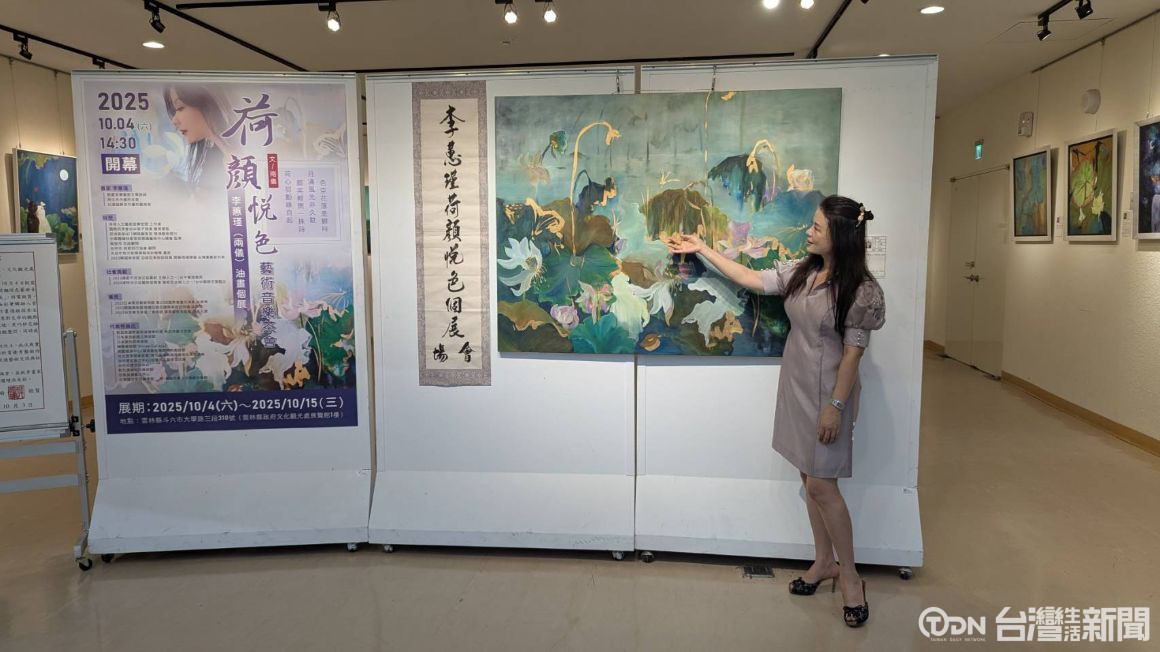 ▲藝術家李蕙瑾長年以荷花為主要創作主題,擅長將音樂、文學、詩詞等養分融入油畫創作,作品除了呈現荷花的各種姿態,每一幅也都傳達她對生命的體悟,她的個人展覽「荷顏悅色」,目前正在雲林縣文化觀光處展覽廳一樓展出 / 記者 王可萱 攝