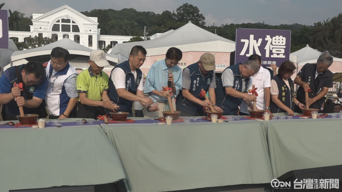 南投縣長許淑華與貴賓,上台示範擂茶。這是南投世界茶業博覽會主題活動之一,千人擂茶,現場吸引許多民眾參與,不少家長帶著小孩一起同樂,趣味的體驗,讓小朋友玩得很開心。