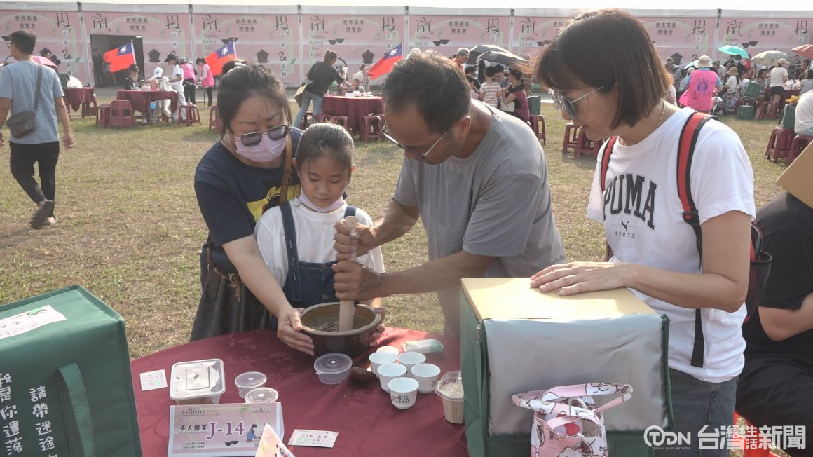 在充滿客家元素的布置及表演中,大人小孩歡喜體驗客庄文化的樂趣,並享受美味又養生的擂茶,現場氣氛相當歡樂。