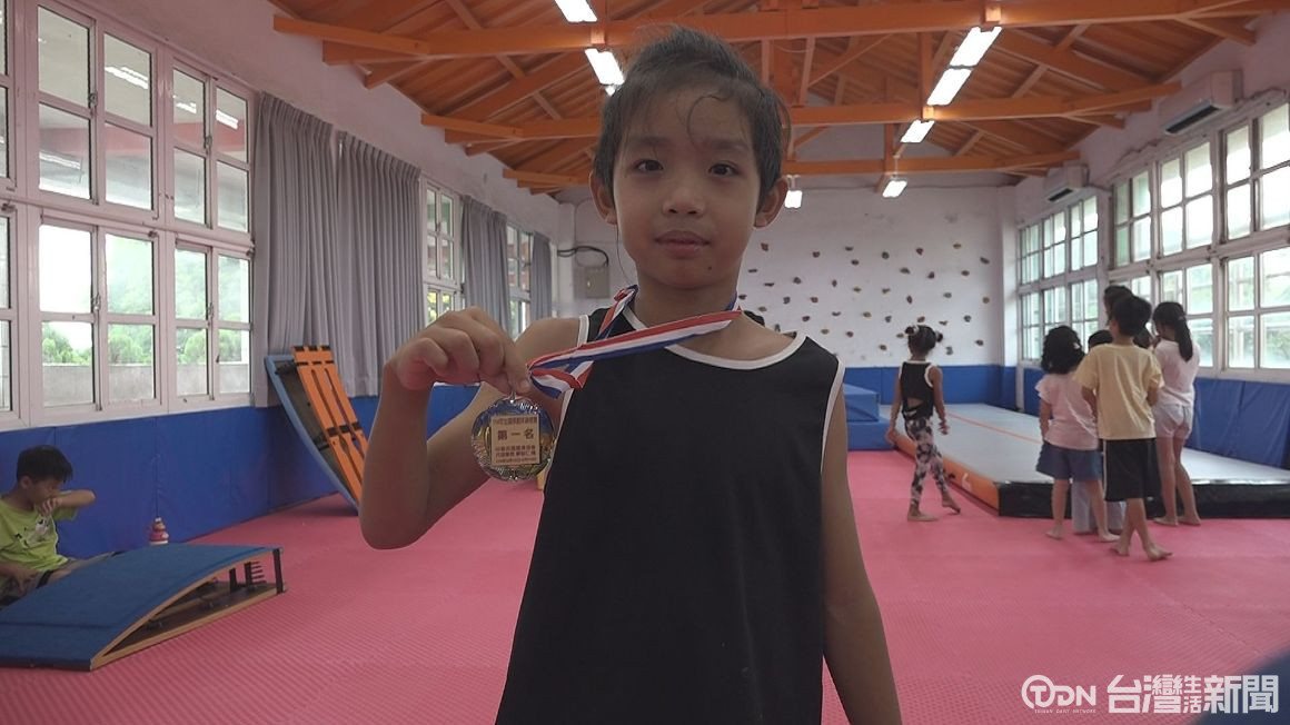 ▲崙背鄉陽明國小的「肌塊兄妹」哥哥廖瓦石,榮獲114年全國彈翻床錦標賽第一名。記者 謝沂辰/攝