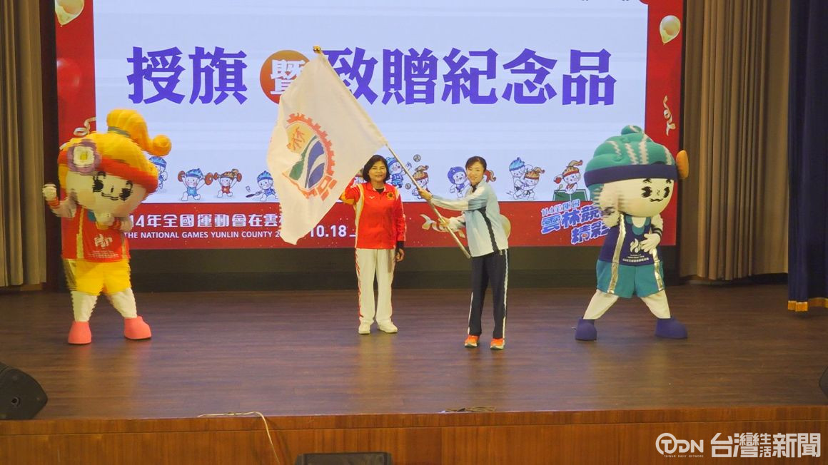 ▲雲林縣長張麗善授旗雲林隊代表隊, 喊話發揮地主隊優勢奪21金,同時縣府也將金牌獎金提高至35萬元/記者 江儀 攝