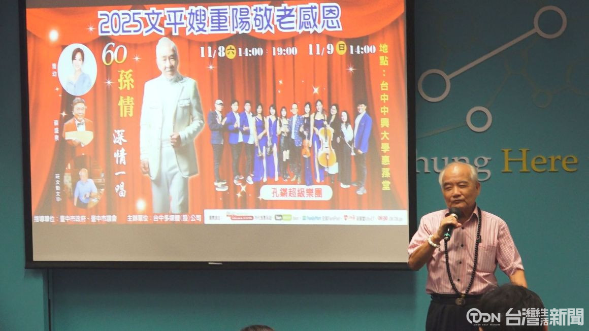 今年主辦單位更邀請白沙屯拱天宮媽祖駐駕現場,讓觀眾可現場祈福、鑽桌腳求平安,活動將於11月8日、9日在中興大學惠蓀堂舉行,歡迎所有民眾帶著家中長輩,一起唱出愛、聽見孝。