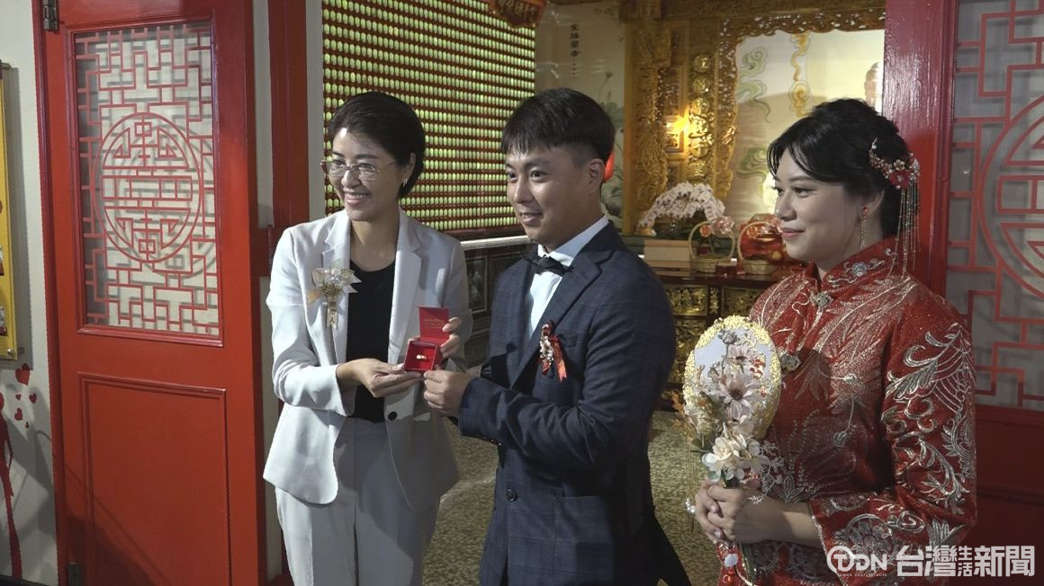 ▲今年竹山紫南宮贈送土地公身上金牌打造的金戒指,由許縣長贈送給新人代表,祝福30對新人平安富貴,長長久久/記者 范宏坤 攝