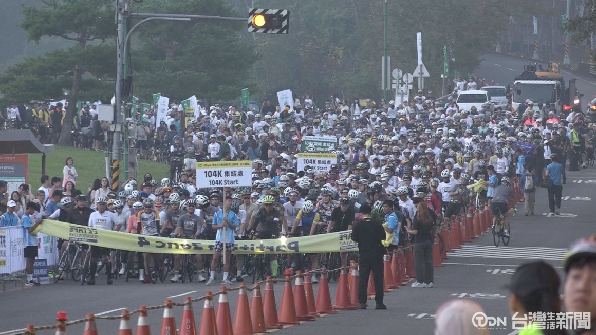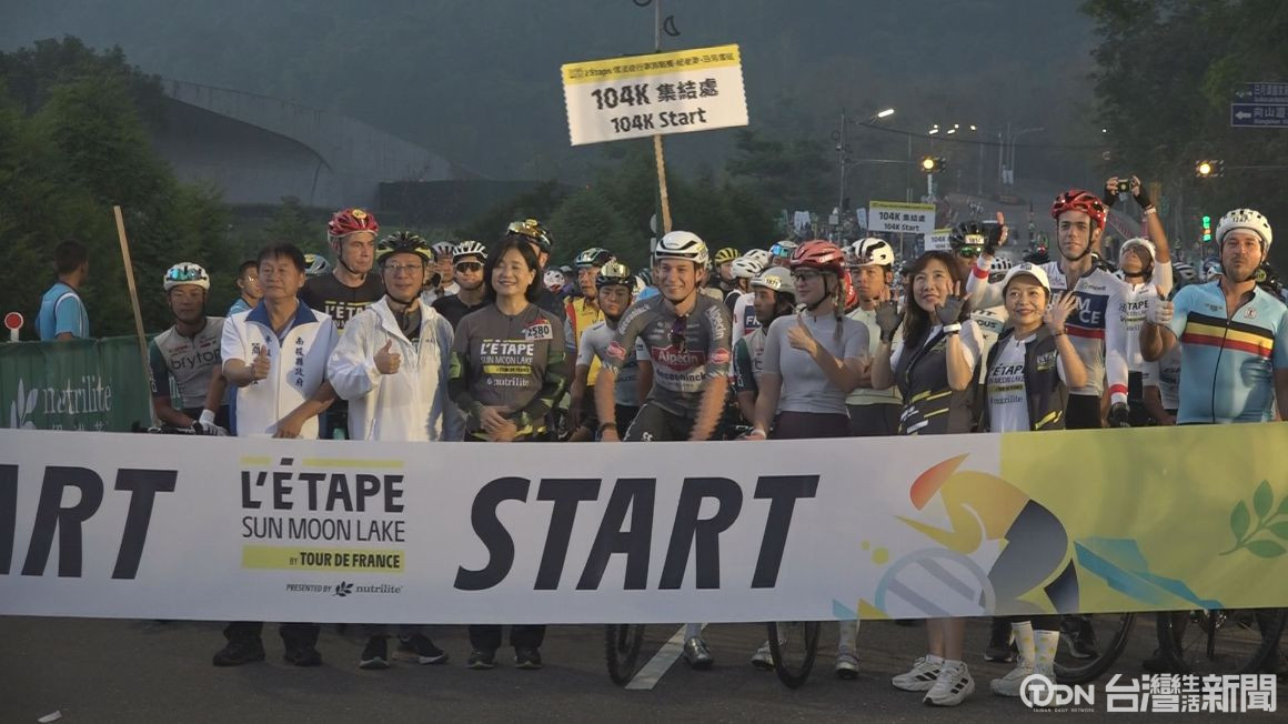 一早天還沒亮,參加日月潭環法自行車挑戰賽的選手,在向山遊客中心集合,並且進行暖身運動,做好出發的準備。在長官來賓的鳴笛之下,來自世界40個國家,超過2200位選手,從向山遊客中心外大馬路分批出發,場面非常壯觀。
