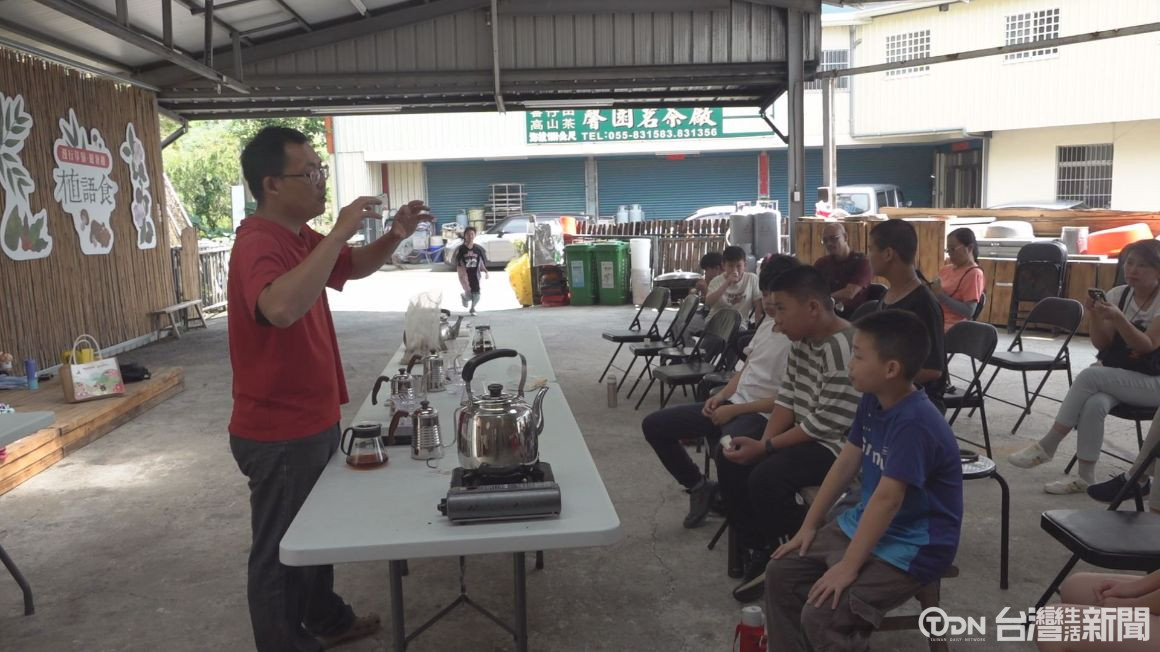 小朋友認真聽在地農民教他們如何沖咖啡,這個場域是古坑石壁休閒農業區內的「植語食堂」,石壁休區發展協會理事長賴郁憲說明,這其實是他們特別向阿里山國家風景區管理處申請的「特色場域」,除了提供給休區內如學校等各單位使用,也作為在地遊程體驗,及享用特色餐的場所。