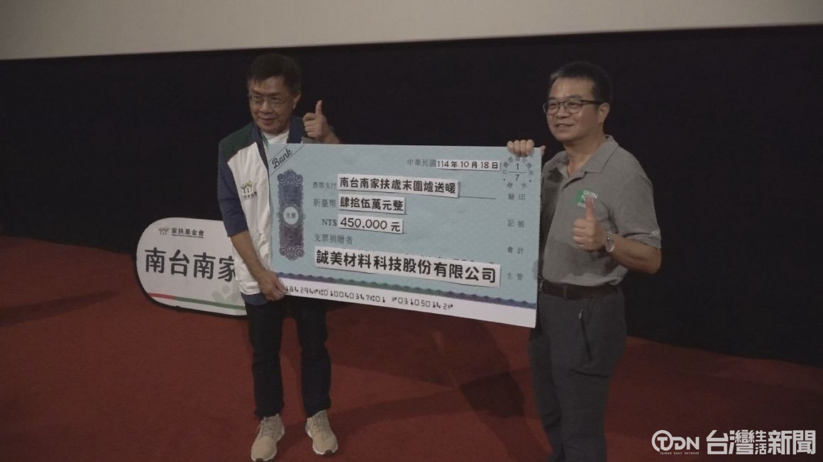 平常為了生活常常很忙碌賺錢的的弱勢家庭,這次有機會抱著歡喜心到電影院看電影,享受難得的假日時光,這是南台南家扶中心的受助家庭,得到在地科技材料大廠發揮共創美好未來的企業社會責任,除了包場招待200位親子看電影,同時還加碼認養300份愛心禮包,來扶助家庭在歲末圍爐的45萬餐費,場面溫馨。