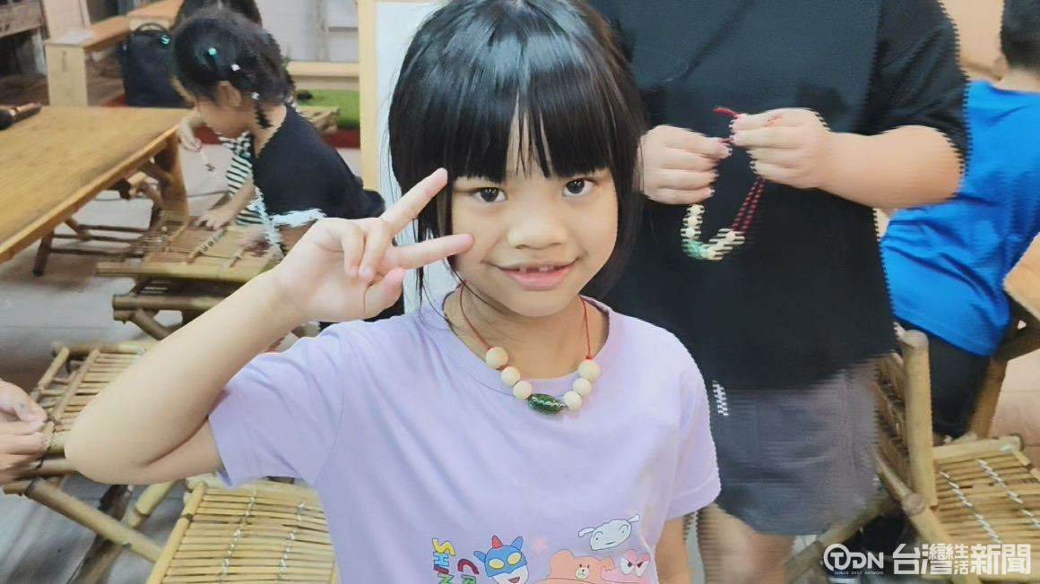 ▲課輔班小朋友自己動手做,手鍊坐不下改為項鍊一樣好看/記者金芸亘攝