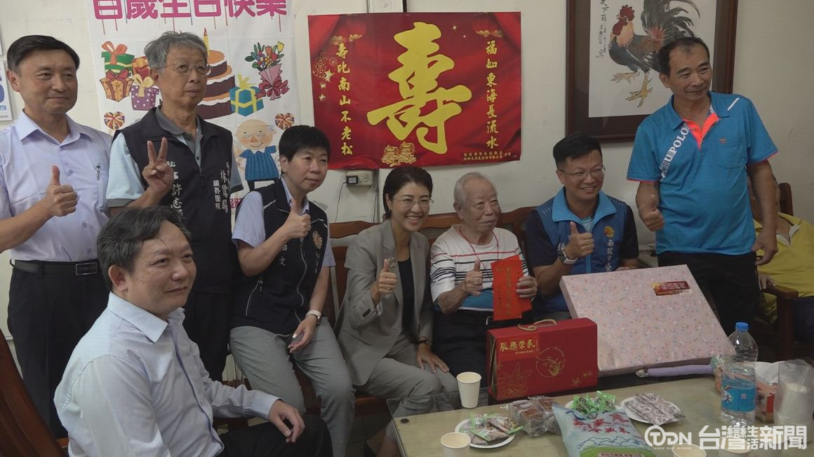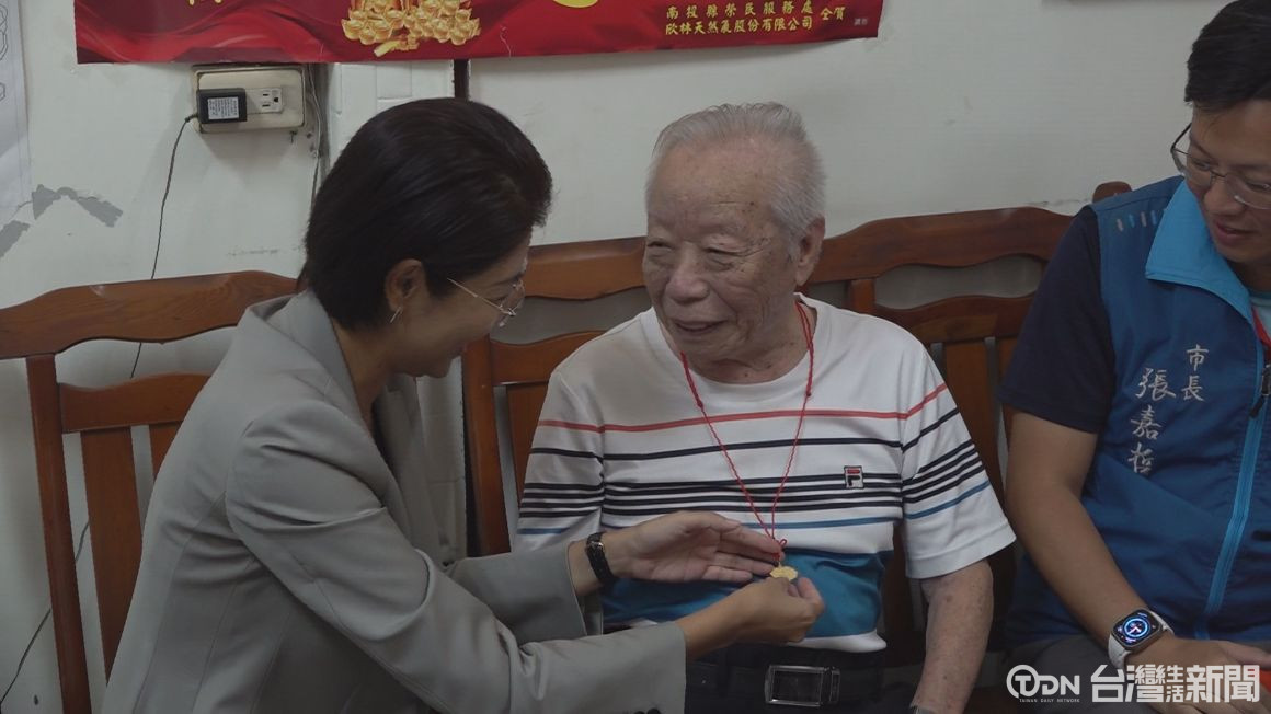 ▲南投縣長許淑華為南投市老榮仁瑞掛上金鎖片一枚,祝福他健康長壽/記者 廖韋凌攝