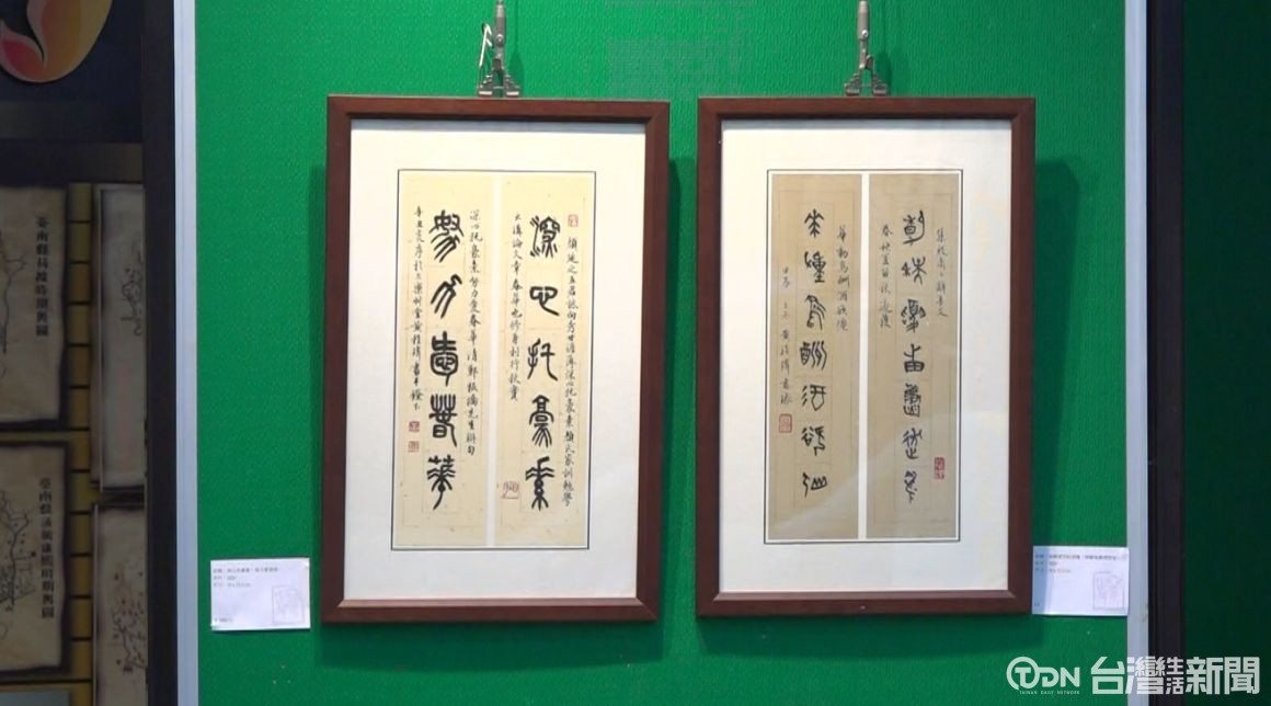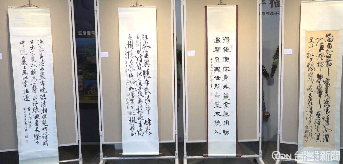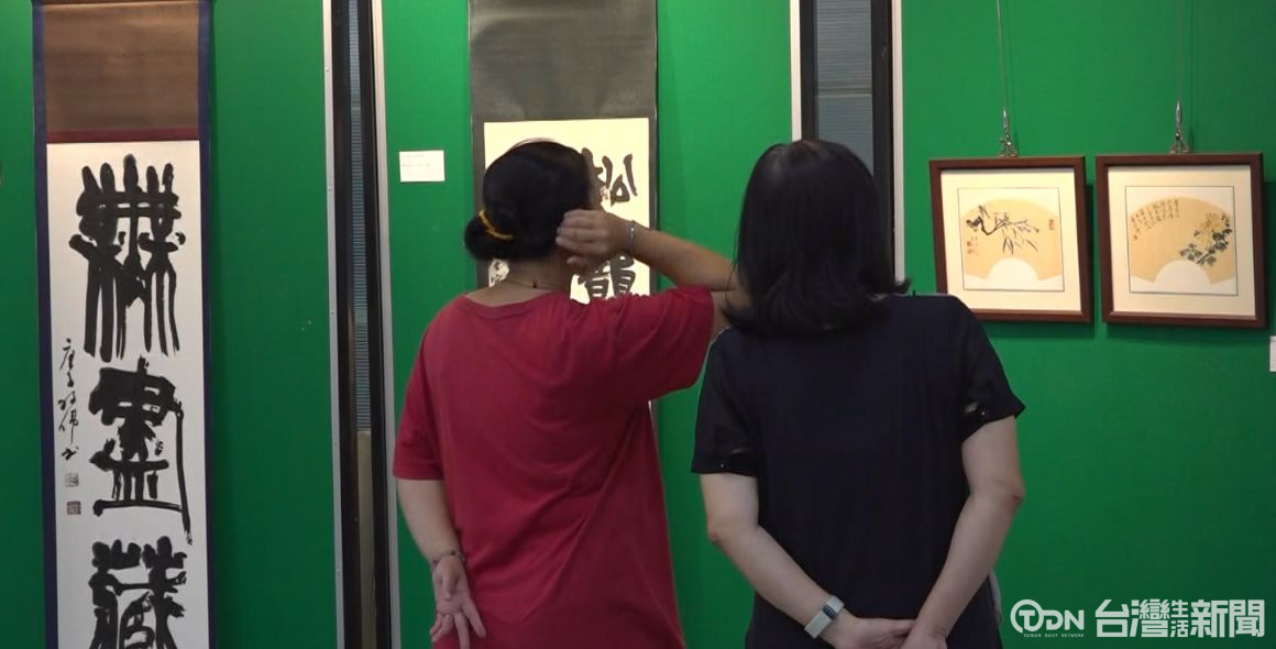 ▲藝術家黃程瑋在民治市政中心舉辦個展,展出多幅書畫作品。/記者 沈孟瑩攝