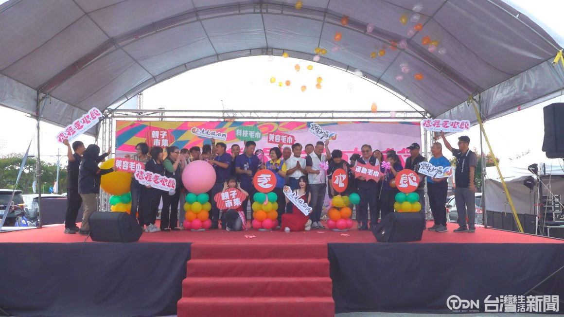 眾人一起搓破氣球,宣布第十二屆虎尾毛巾節開幕,虎尾鎮公所說明,今年的活動是以「創新、躍動」為主題,現場可以看到精品毛巾、科技功能毛巾、美容毛巾、運動毛巾跟家庭日用毛巾等等多元產品,他們也特別在會場設置最新產品展區,讓民眾採購以外,也能實際了解目前毛巾產業的動態發展。
