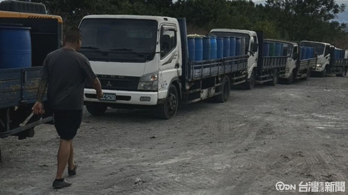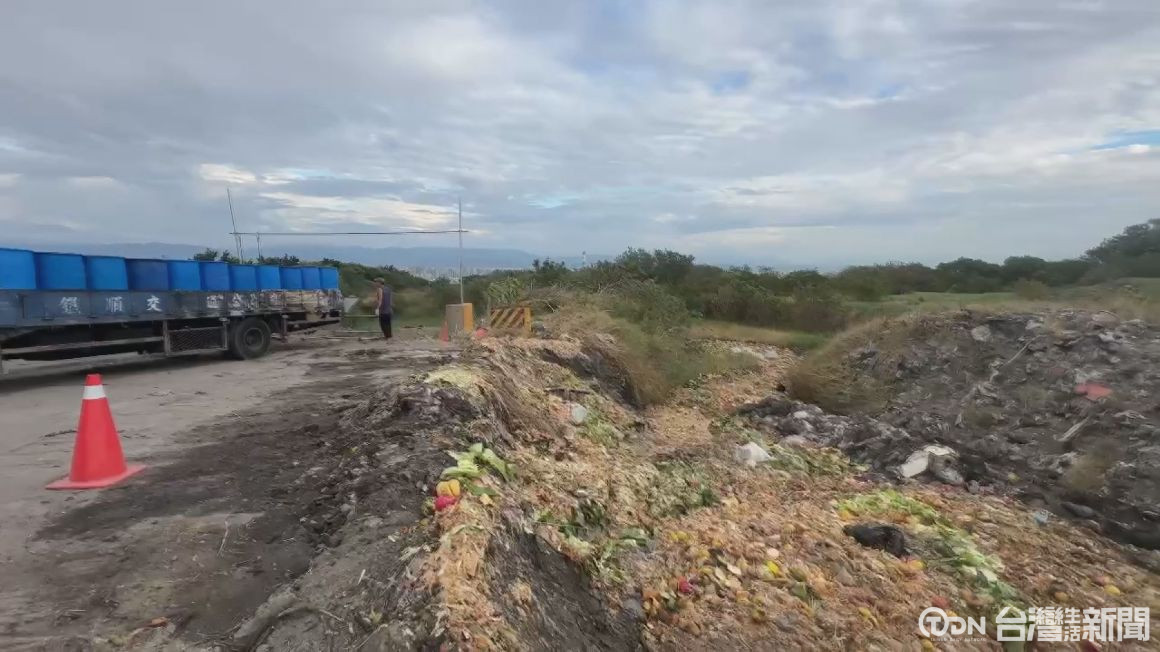 大量廚餘清潔車陫隊,等待進入文山掩埋場處理,台中市議員何文海質疑疑廚餘是否未經合法合規處理而就地掩埋。