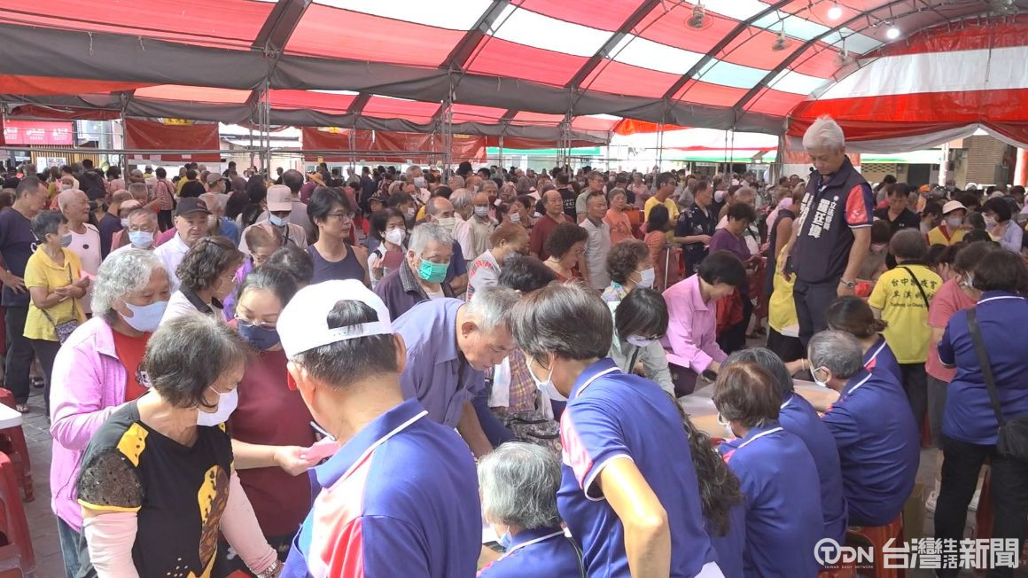 ▲重陽節前夕,台中樂成宮發放5800人領紅包、麵線/記者 林佳樺攝