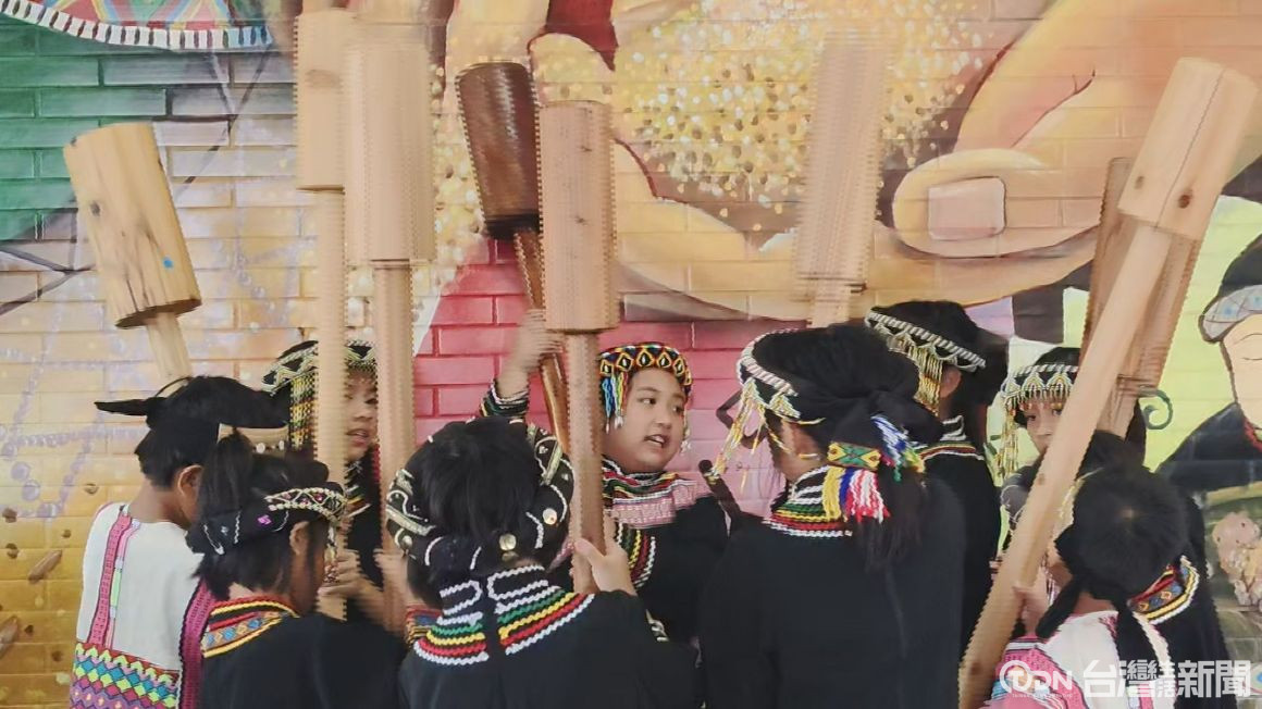 ▲小朋友利用臺大實驗林捐贈的木杵來表演屬於布農族的傳統杵音//記者金芸亘攝