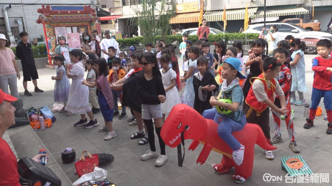 ▲古坑國中小國小部30號進行萬聖節踩街,全校師生變裝上街做英語歌舞表演討糖 / 記者 王可萱 攝