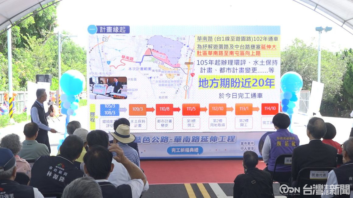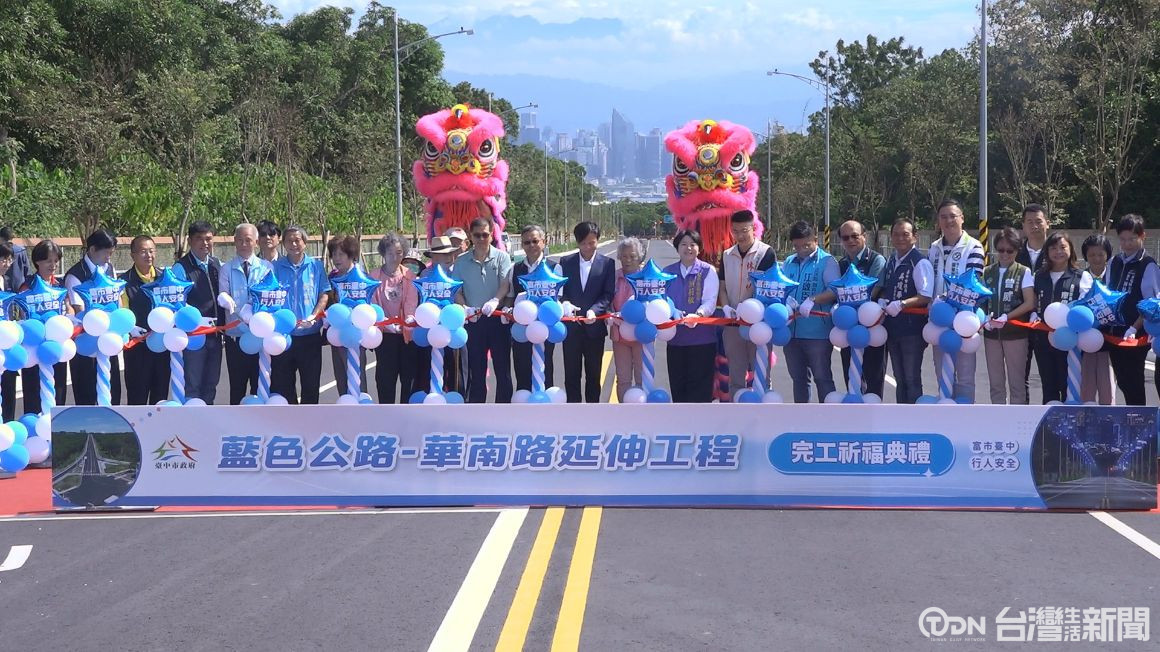 倒數聲下,眾人歡喜剪綵,見證地方期盼近20年的大肚區「藍色公路」華南路延伸工程,終於正式完工,這條全長1.8公里、寬20公尺的道路,從遊園路一路延伸到向上路,除了有效紓解當地交通瓶頸,也串連起大肚區與南屯區交通路網。