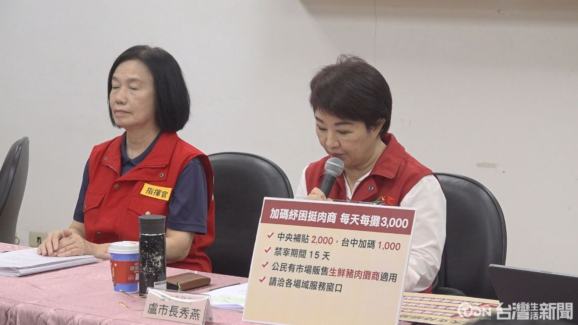 非洲豬瘟影響第一線的從業人員,台中市長盧秀燕這天拍板宣布三大支持措施力挺產業,包括防疫期間養豬廚餘免處理費,廚餘車司機補助每次最高新台幣1500元,以及加碼紓困404攤新鮮豬肉商1萬5000元,加上中央補助的3萬元,共4萬5000元。另外案例場兩度採檢仍檢出陽性,啟動國防部化學兵支援