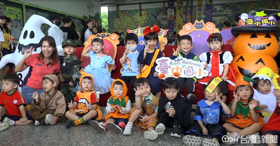 迎接萬聖節,台中國小邀請全校師生,一起大玩搞怪裝扮,小朋友扮成小萌鬼,各種搞怪風格紛紛出籠,大家一起集合在校門口拍照留念,還有結合英語的闖關活動,讓學生在充滿趣味的挑戰中,感受萬聖節的歡樂氣氛。