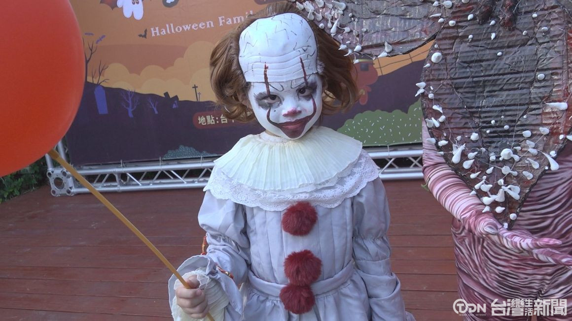迷你小丑報到,看來十分詭譎,旁邊還有牙齒花相伴,小吸血鬼以及長髮公主等都來齊聚,250組親子精心裝扮,各式各樣的萌鬼造型出動,現場可愛指數破表。