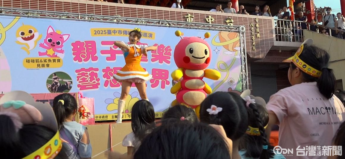 推廣藝文氣息,台中市文化局舉辦台中市傳統藝術巡演活動,這天在大里金城宮登場,主辦單位規劃在地舞團,及親子DIY等節目,還邀請親子電視台的姊姊與公仔現身,吸引大小粉絲一同熱舞,場面相當熱鬧。