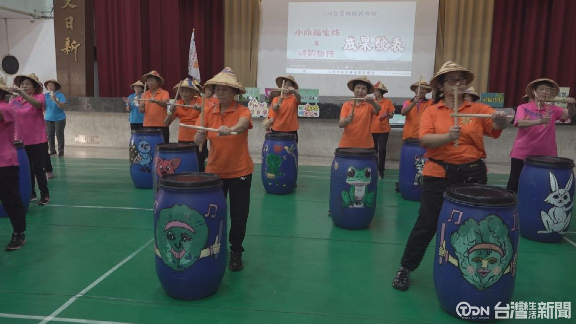 為推動福利社區化,大埤鄉尚義、北和、南和跟怡然4個社區組成「共轉義和然」小旗艦,跨社區互相合作、學習以外,也共同參與中正大學社會福利學系教授吳明儒的「時間銀行」計畫,今年度的成果展覽,日前在大埤國小盛大登場,會上由4社區成員組成的「玩埤不老樂團」,也初次登台演出,打用酸菜桶作的鼓,展現高齡社區社區滿滿活力。