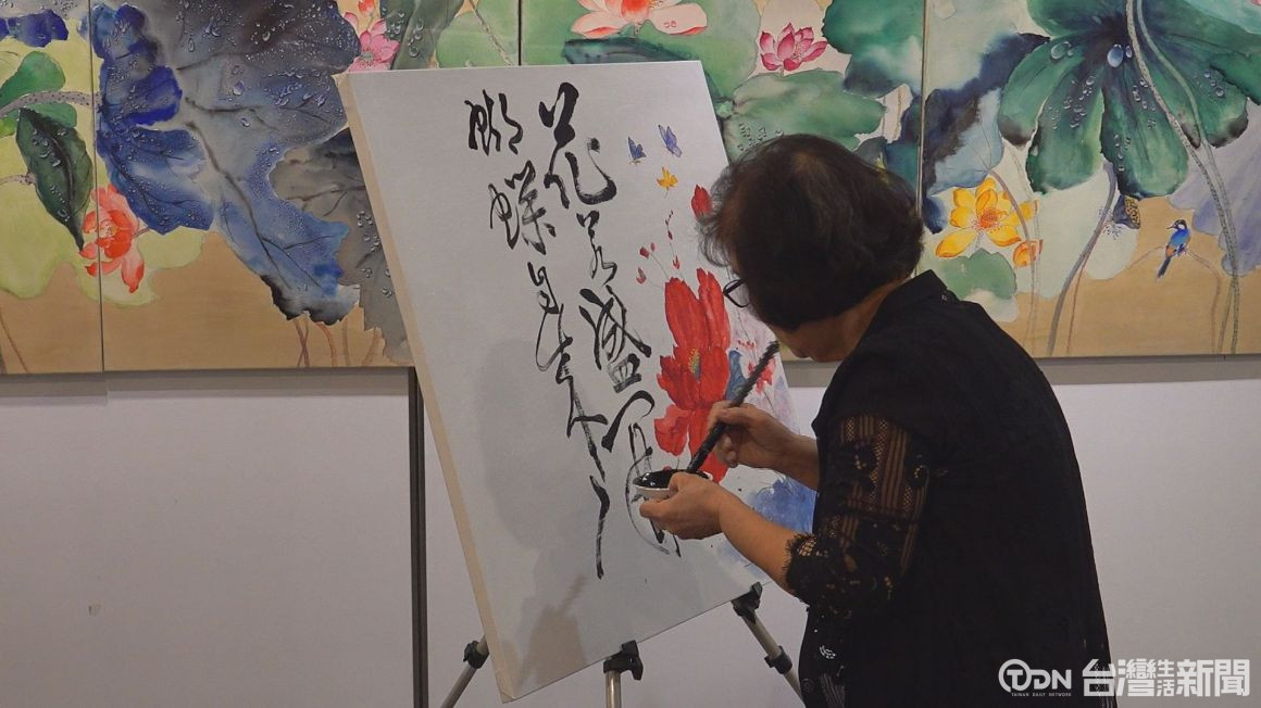 ▲施美燕老師於展覽開幕式現場揮毫,並搭配優美音樂及太極拳表演,讓民眾能感受國畫與書法的文化力量。/記者 陳佳昇 攝。