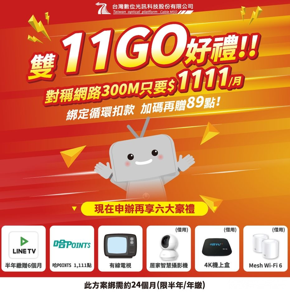 活動期間申辦「對稱光纖網路300M」方案,即可獲得「雙11 GO好禮」六大超值贈品: