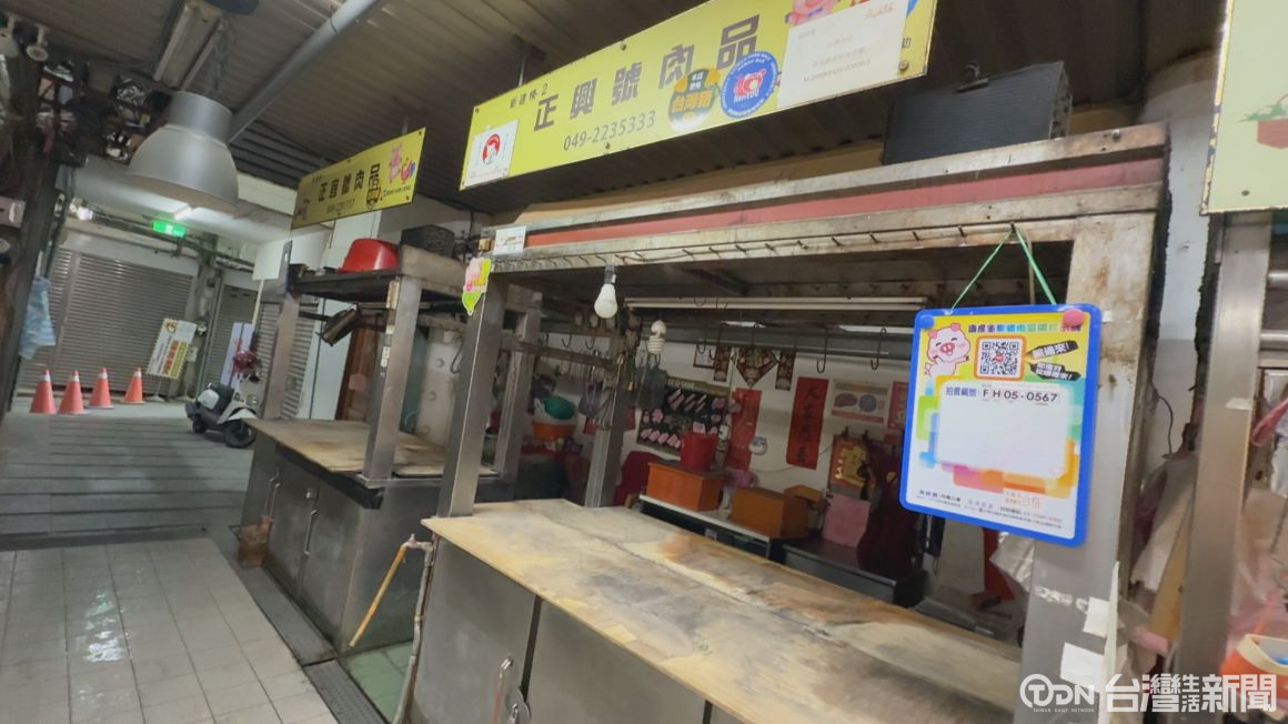 ▲南投公有市場內的豬肉攤商,7日為明天的開市做準備/記者 廖韋凌攝