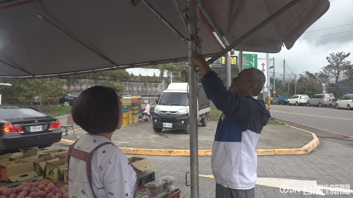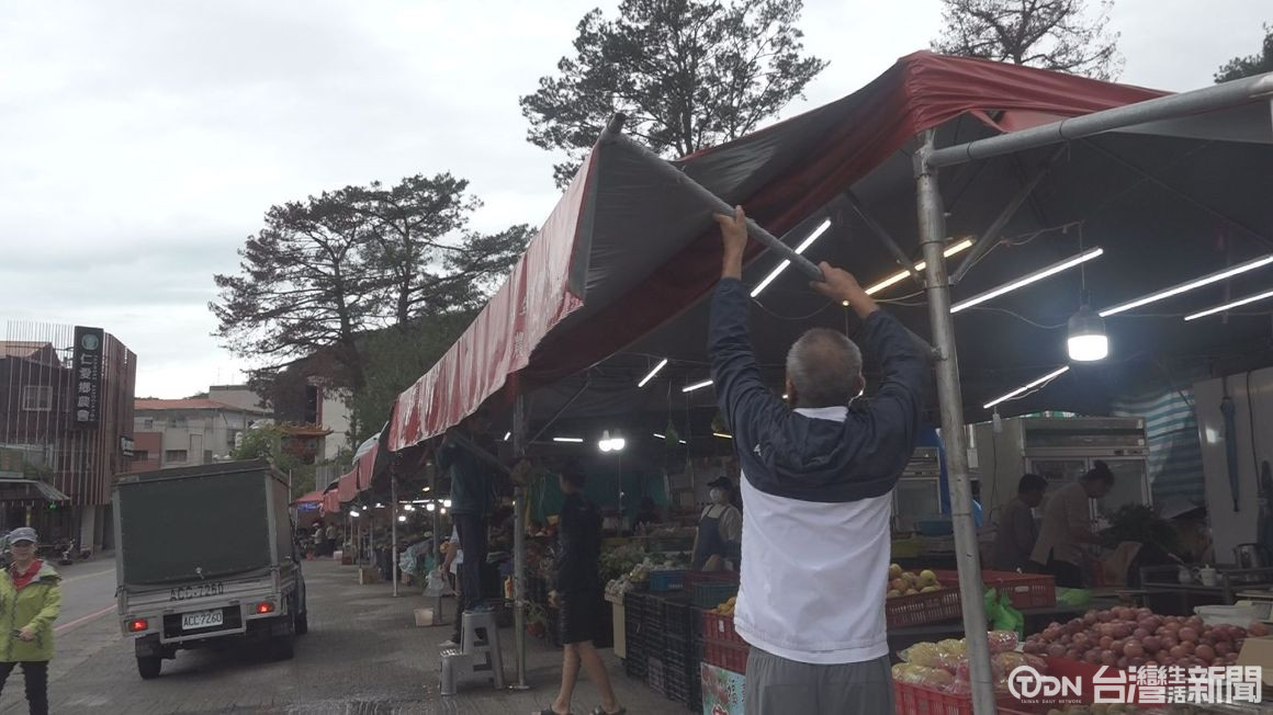 霧社農民市集,攤商邊做生意,也要加強防颱準備,由於市集棚架,曾遭颱風吹襲受損嚴重,攤商除了綁牢固定,也將遮陽棚放下,擋風也可以避免掀翻。