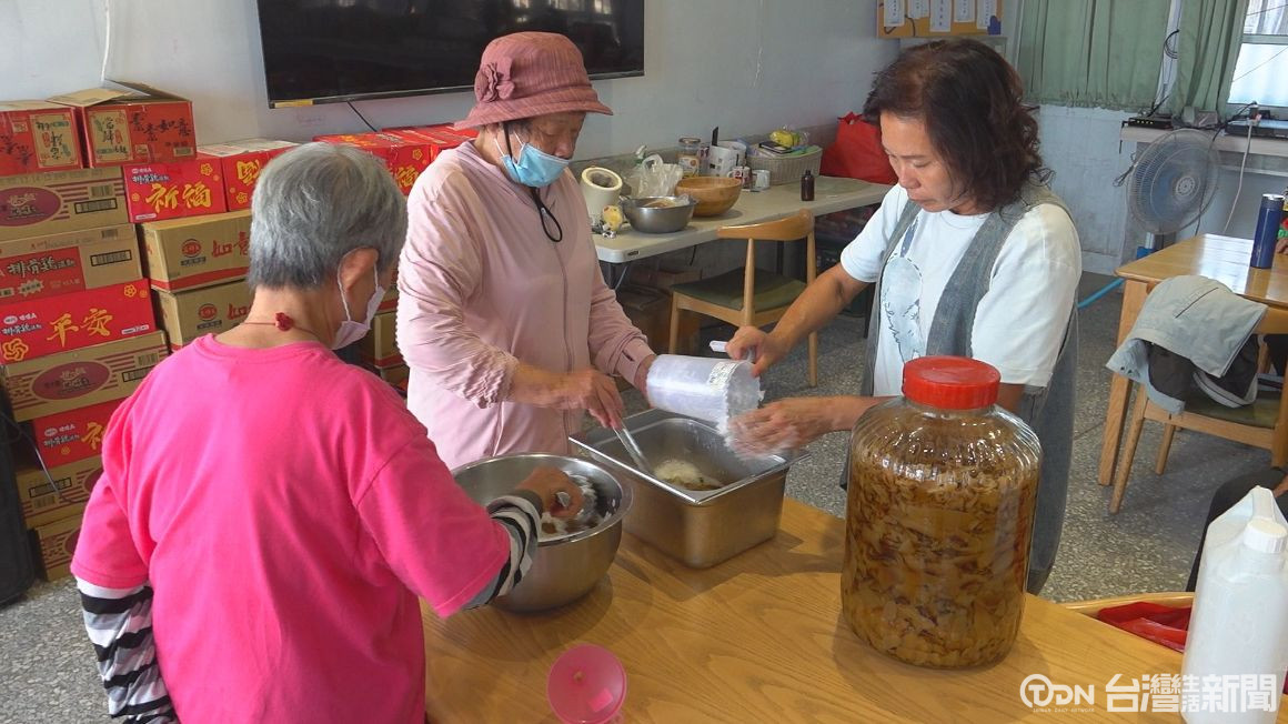 ▲長輩照著老師的指導,準備要來將天然的柚子清潔劑裝在罐子裡。/記者 陳佳昇 攝。
