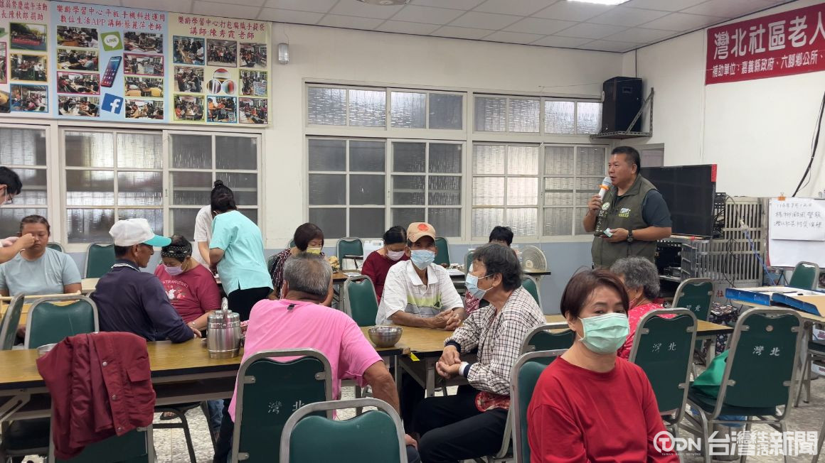 ▲嘉義縣慈協在六腳灣北社區舉辦「愛心義煮關懷長輩」活動,長者齊聚共餐,現場洋溢溫馨笑聲/記者黃培怡 攝。