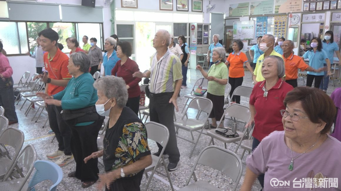 長輩跟著音樂節奏做動作,現場氣氛相當熱鬧。富州社區,114年度福利社區化小旗艦計畫,特地為社區獨居長輩所舉辦的同樂會,透過趣味闖關的方式,讓長輩動腦,也訓練手腳。