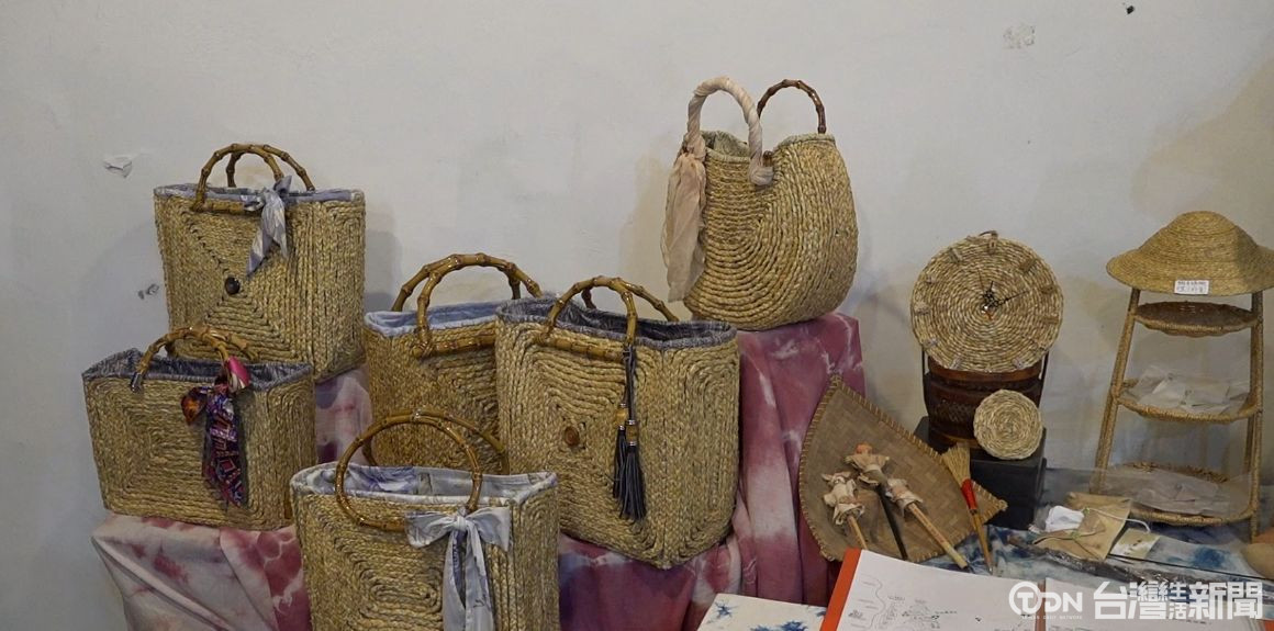 ▲除了天然植物染劑,健民家政媽媽也將稻草,發揮創意陸續製作了編織包,及掛鐘等等生活用品/記者 賴秋峰攝