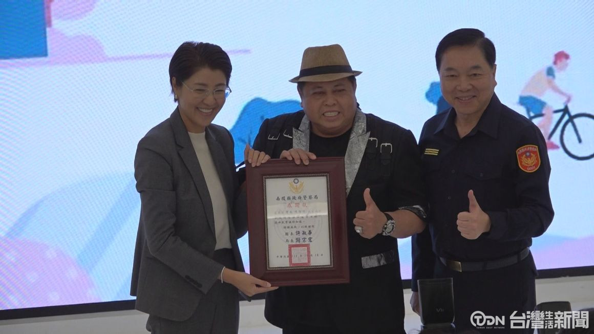 ▲縣長許淑華與縣警局長謝宗宏一同頒發感謝狀給藝人黑面,感謝協助推廣反詐騙觀念/記者 蔡育楷 攝