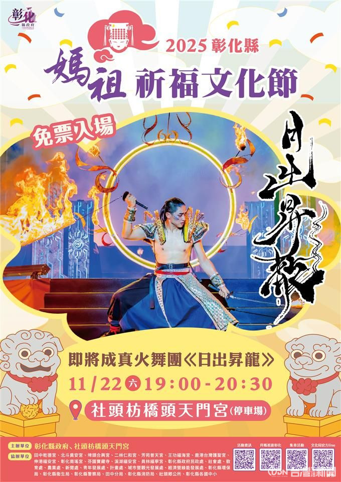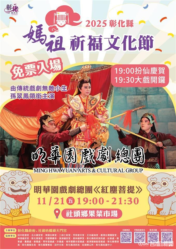 一年一度、全台信眾引頸期盼的「2025彰化縣媽祖祈福文化節」舞台表演秀,今年以「祈福、文化、藝術」為主軸,將於11月21日至23日在社頭鄉枋橋頭天門宮隆重登場。活動邀請「明華園戲劇總團」、「即將成真火舞團」及多位金曲歌手接力演出,連續三晚以傳統結合創新藝術,為彰化點亮信仰與祝福的夜空。
