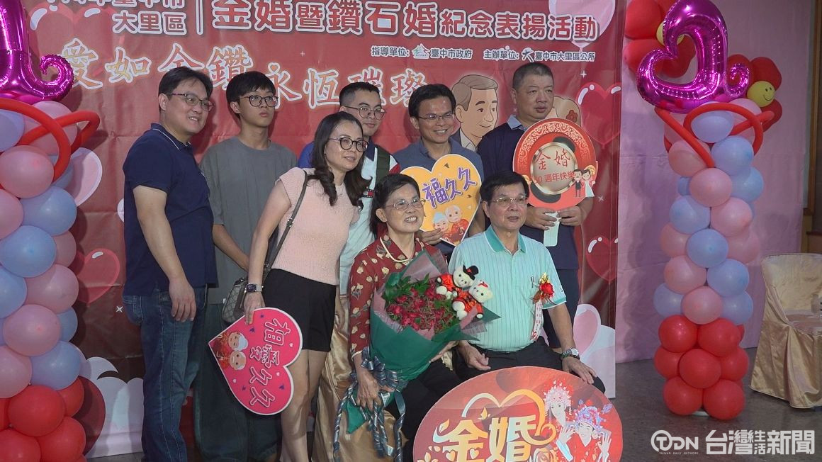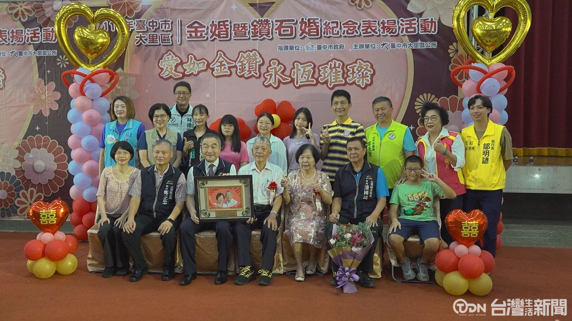 一對對賢伉儷依序上台,跟親友一起留下永恆紀念照片,大里區公所日前舉辦「114年金婚暨鑽石婚紀念表揚活動」,邀請大家見證長輩們堅貞不渝的愛情。