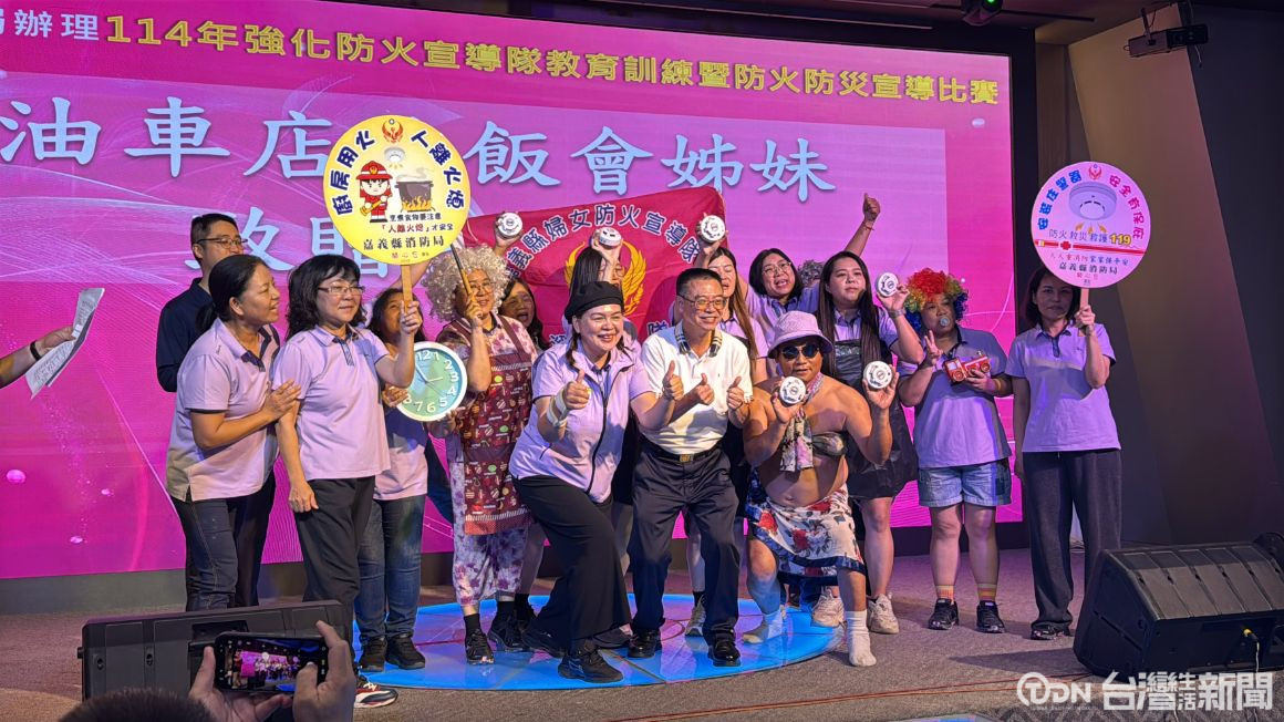 ▲嘉義縣防火宣導志工隊延續25年的熱情,走入社區宣導防火與用電安全,用心的宣導隊裝扮更成為全場亮點/記者黃培怡 攝。