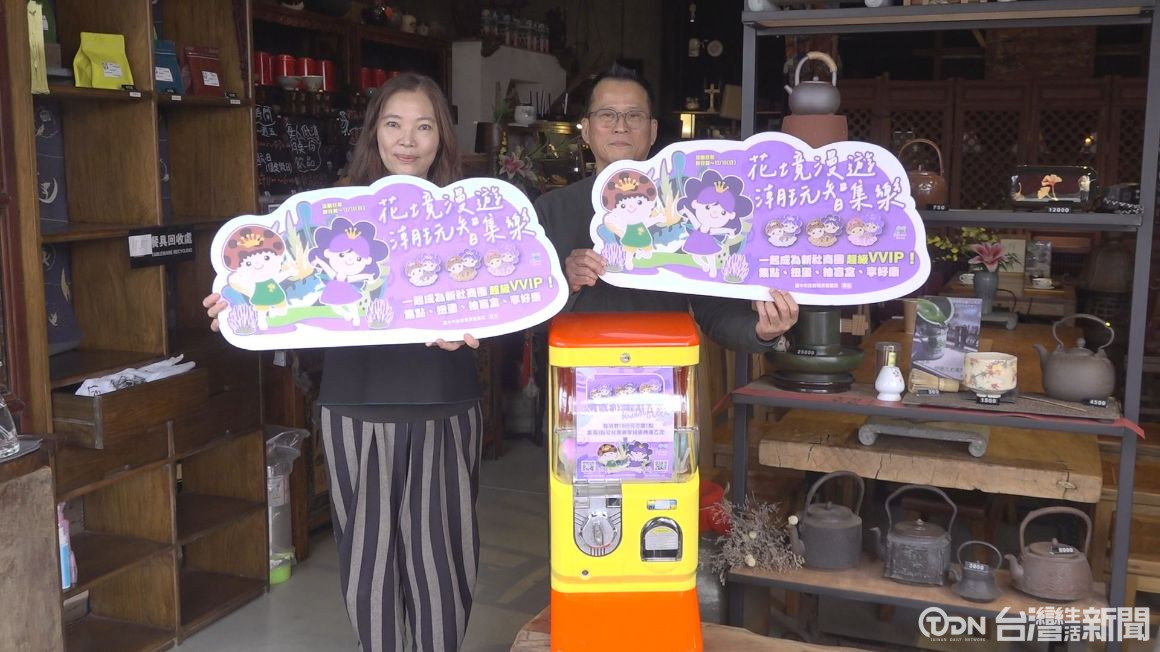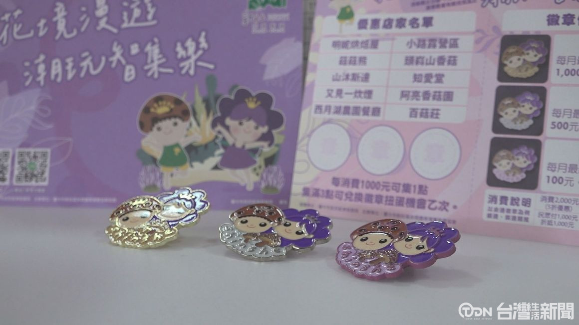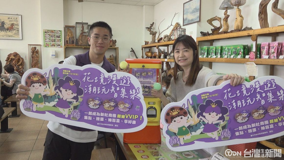 來新社消費,荷包不會太傷,商圈最近推出消費滿額抽扭蛋盲盒活動,特別以香菇王子與花仙子的Ip打造金銀紫徽章,最高可抽中ㄧ千元電子券折抵。