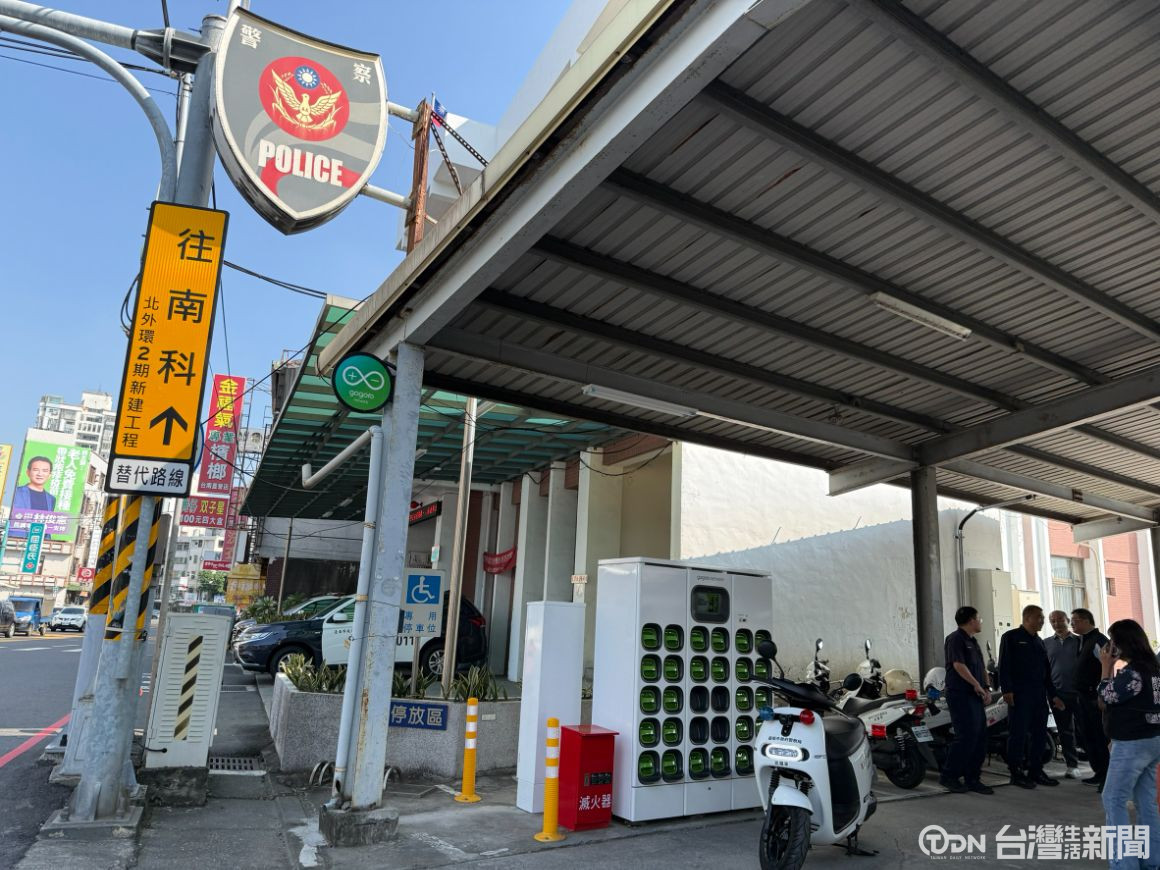 ▲臺南第三座「警民共用」的電動機車電池交換站完成啟用。/ 記者 林詩涵 蕭建緯 攝