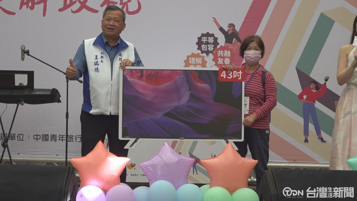 ▲民眾摸彩抽中液晶電視,南投縣副縣長王瑞德頒獎/記者 范宏坤 攝
