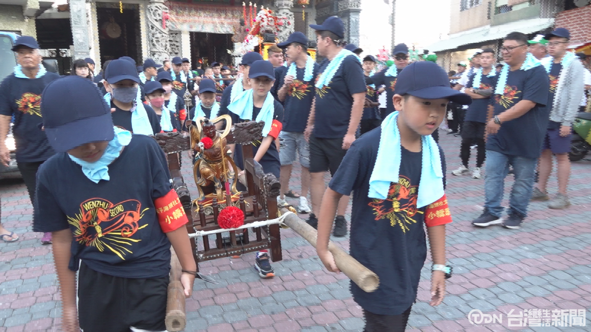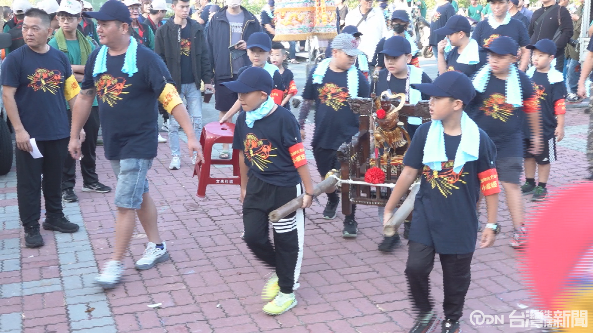 一大早多名國小學童聚集安平文朱殿廟埕前,任務是要幫太子爺扛轎出巡,大家都感覺很新奇趣味。