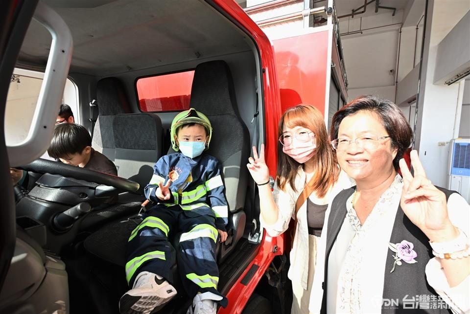 ▲榤寶搭上警車與消防車,不僅是圓夢,更希望在治療路上帶來力量與希望/圖:彰化縣政府提供