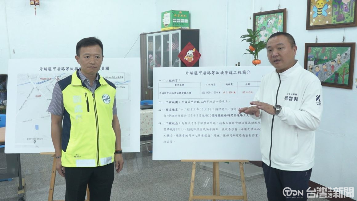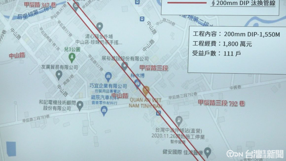 由於外埔區中山路一期管線汰換工程,已順利完工,因此這次民代也順利爭取到1千8百萬元,針對甲后路三段進行施工,將採用新型的延性石墨鑄鐵管,以提升耐漏性與耐久性,並藉由回填與路面重鋪,修復被破壞的路面。