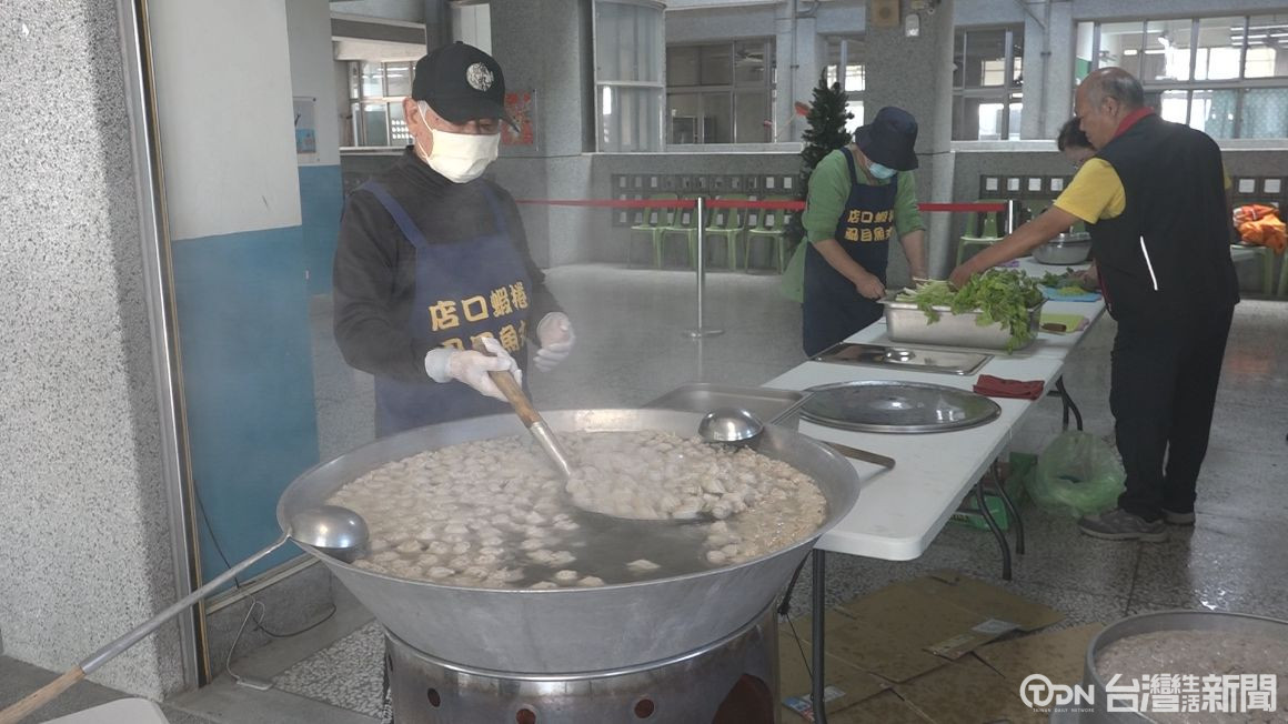 圖為一大早,魚丸伯和志工團隊就抵達炎峰國小,現場備料、製作、烹煮,要讓孩子能吃到最新鮮的魚丸湯/記者林妤昕攝
