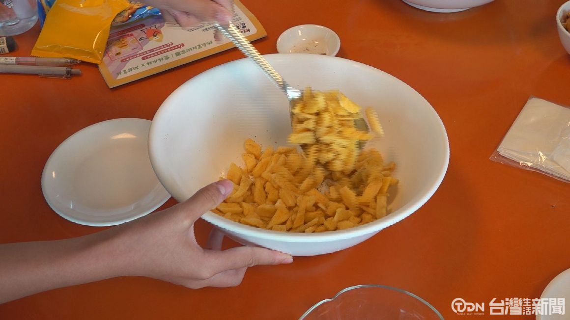 ▲本次課程結合蝦子零食、地瓜酥片來讓小朋友料理,同時在課程中介紹白蝦養殖過程及蝦類,讓孩子能知道餐桌上的各項食材,也珍惜食材的得來不易。/記者 陳佳昇 攝。